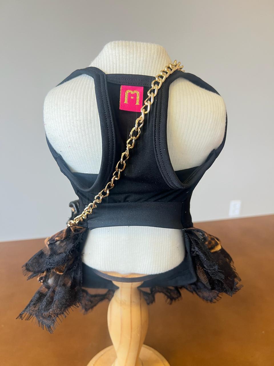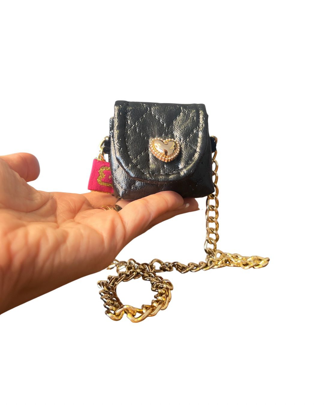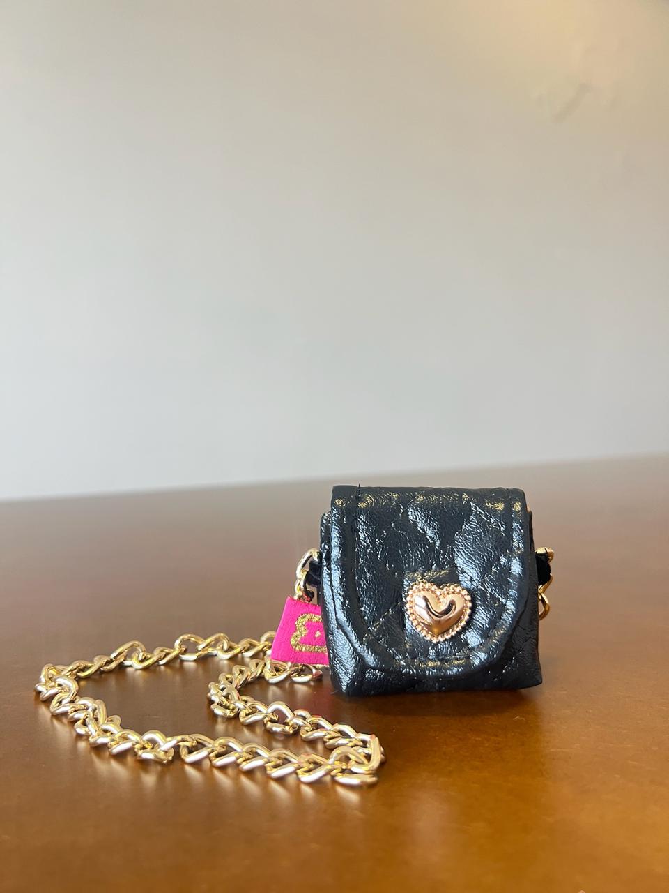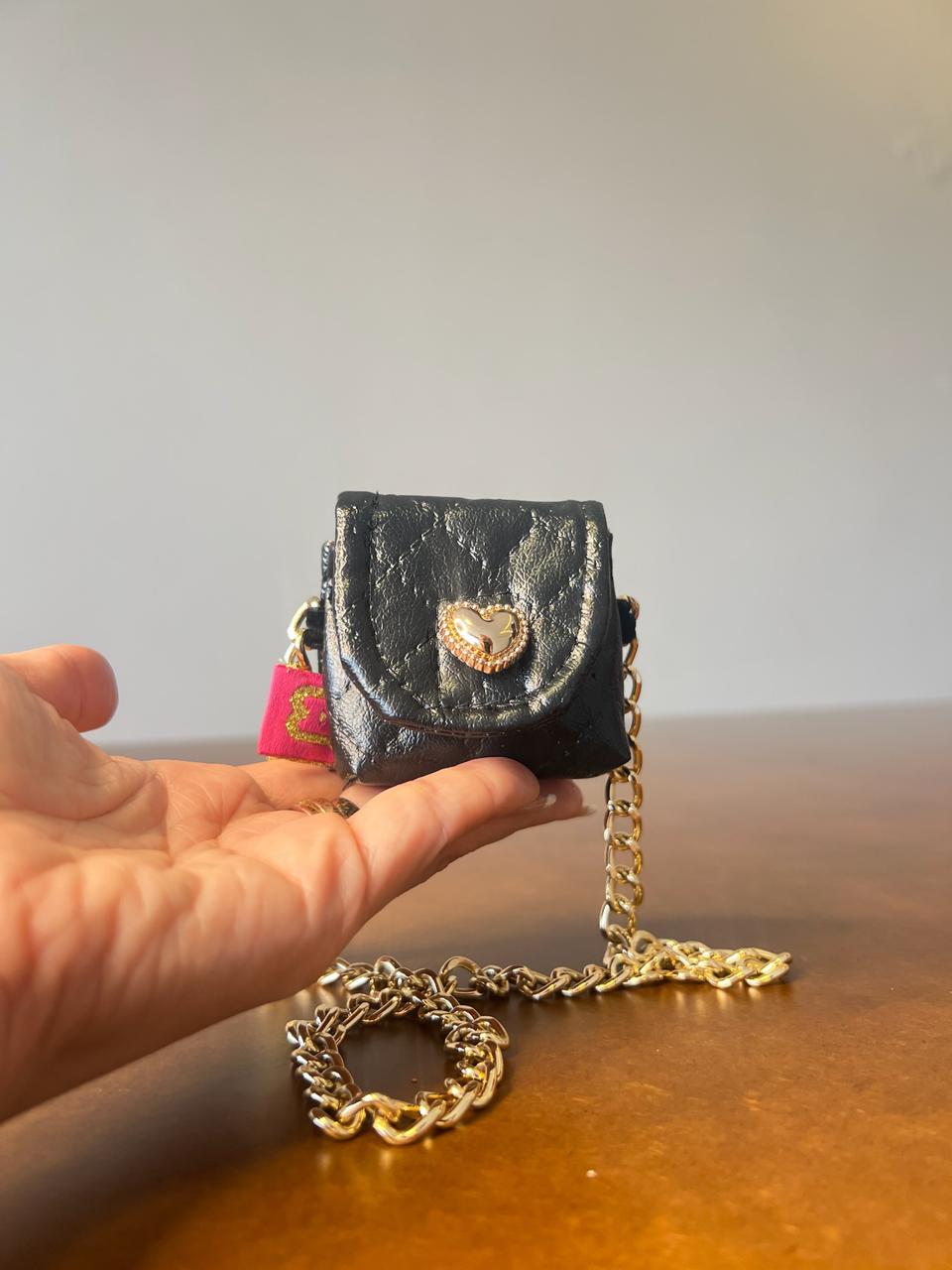 – Bolsinha tecido courino com alça dourada e botão coração.